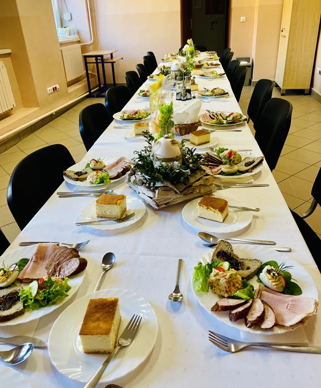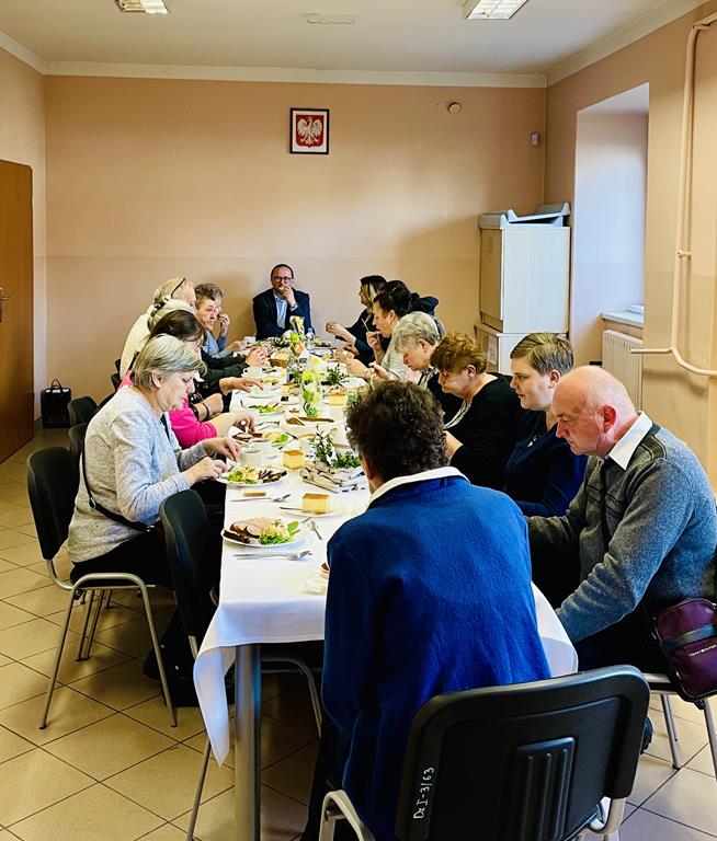 Zaproszeni goście zasiedli do świątecznego stołu, na którym nie zabrakło tradycyjnych potraw takich jak m.in.: kiełbaska wielkanocna, jajka z chrzanem oraz sernik. Wspólne spotkanie odbyło się w ciepłej i radosnej atmosferze. Dziękujemy uczestnikom za przybycie z nadzieją, iż tak miłe spotkania na stałe zagoszczą w murach Ośrodka Pomocy Społecznej.